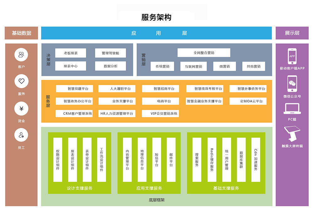 APP企业产品家族:P5业务支撑平台、智慧金融业务支撑平台、OA办公云平台、CRM客户管理系统、HR人力资源管理平台、VIP+会员制营销系统、电子商务信息平台。通过基础功能模块及高级模块实现企业精细化办公管理。