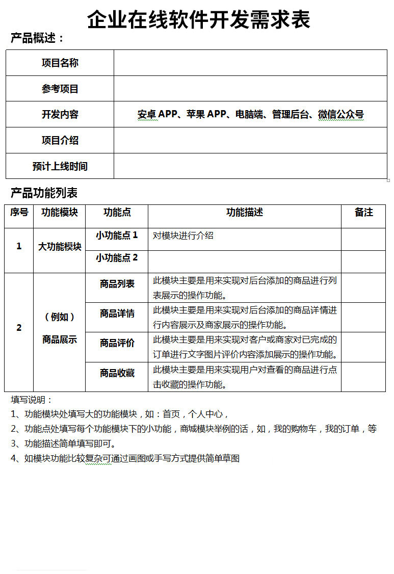 本阶段交付客户需求的初期文档资料。 下图为需求调研表: